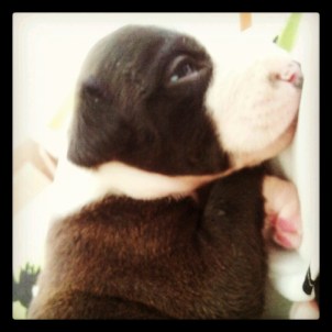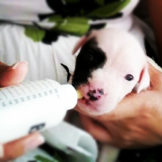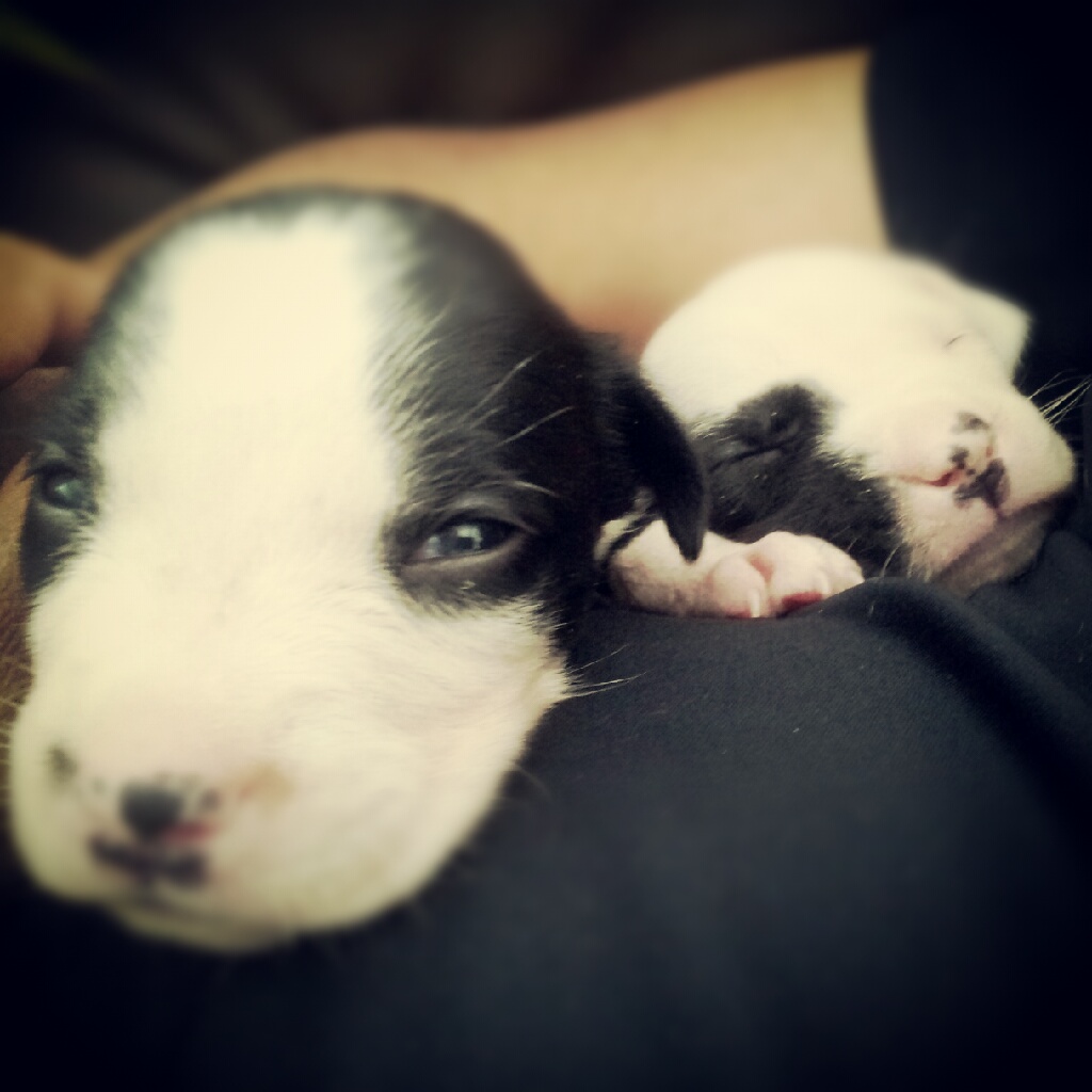 still fighting the flu they inherited from their mother. They are a little over 2 weeks old now and are starting to walk around and play with each other. Caring for puppies this age is much like caring for a human baby; they cry for food every two hours, need to be kept very warm and need tons of affection. I am very much looking forward to seeing them grow into beautiful dogs, survivors of the cruelty brought upon their kind by the carelessness of our kind.