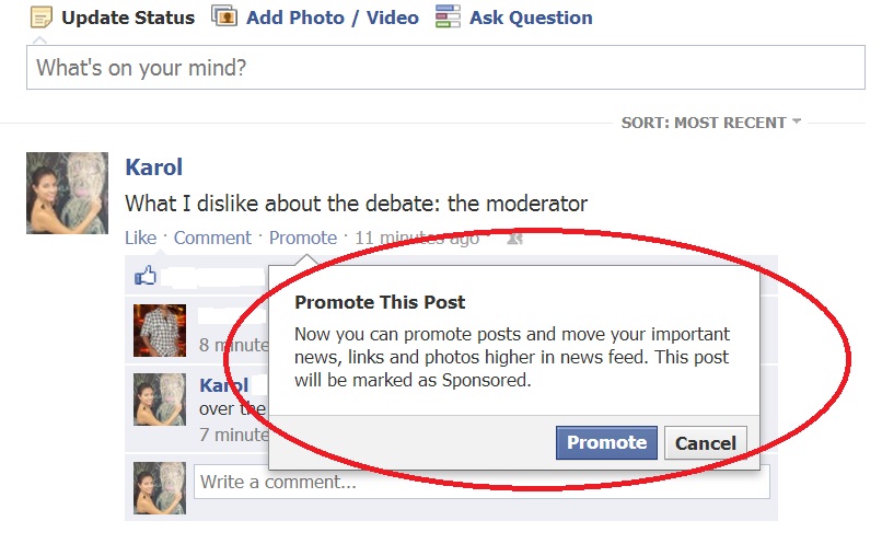 I took to Facebook to post a comment on the vice presidential debate a few minutes ago and the ‘Promote this post’ dialog box popped up. I had already heard about this new feature therefore I was not surprised to see it. However, the fact that there is no clear description of what the service accomplishes was very surprising. Sure, $7 will get my post to show higher in my friends’ news feed…for how long? a day? a week? a month? until I get X amount of impressions?
